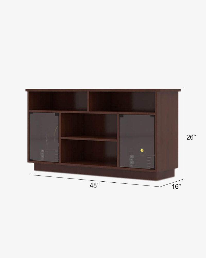 Designed from high density melamine chip boards to provide good durability, this TV trolley is a must have as any television will fit perfectly on it helping to enhance the look of a living room. It is equipped with several shelves and storage compartment for you to store your essential items. The top is also quite spacious for you to keep some showpieces.