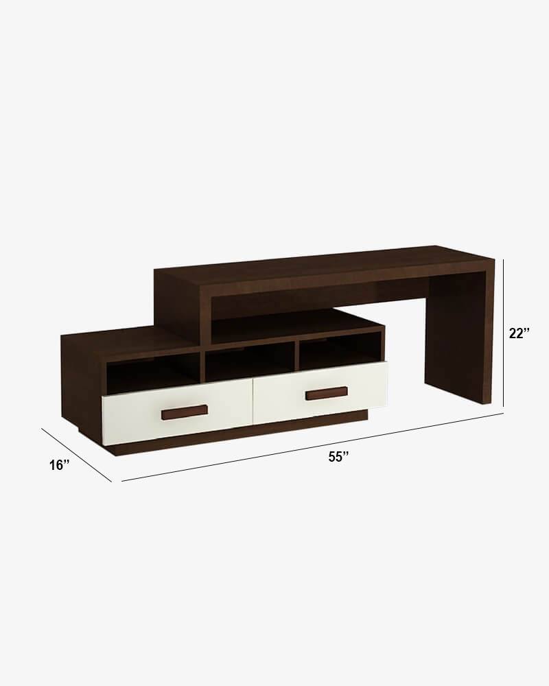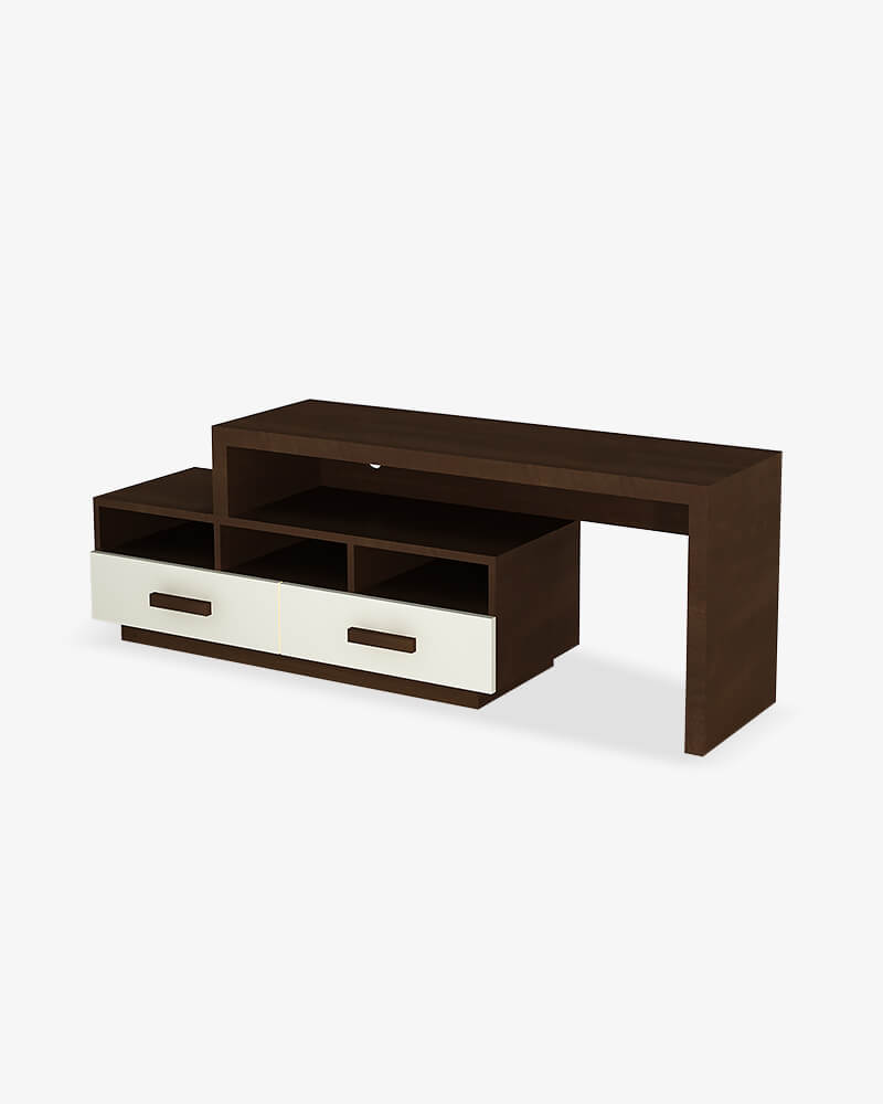 Unique and stylish this refined television cabinet design emanates sophistication. The design style is different from other typical TV cabinets. It has a compact yet asymmetrical design giving the cabinet a very contemporary look. The cabinet is equipped with shelves and drawers. The design is quite functional and has several areas for to place showpieces and other items. It comes with combination of antique polish on the wood and light color variants for the compartment slats.